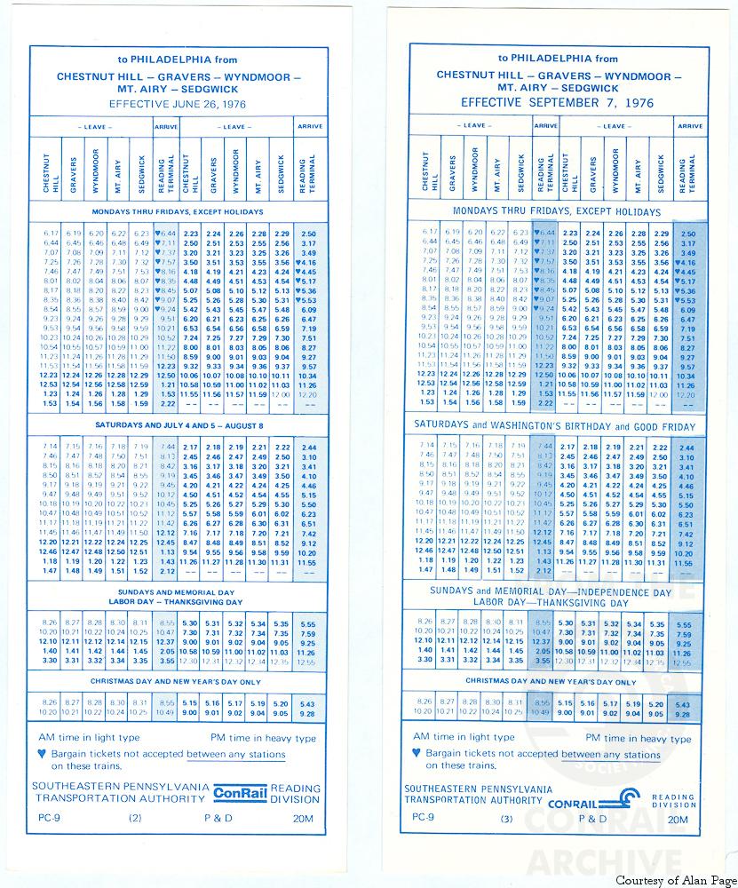 After SEPTA's Reading Diviision initial timetable revision in May 23, 1976 to include the ConRail name in place of the Reading Lines diamond, a second change was implemented in September 7, 1976.