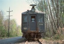 Vintage RDG MU 790 leads a line of ancient MU's at New Hope, PA in April, 1977. Conrail operated the MU's for almost a year over Septa's former Reading Philadelphia Division with their home base at Wayne Junction. A number of the Harlan & Hollingsworth 1931-built RDG MU's were purchased by the New Hope and Ivyland RR, and had recently arrived at their New Hope, PA home in April, 1977.