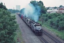 An RF&P GP40 leads three CSX engines as they feed 'em the fuel departing Allentown Yard with a short train. This was likely ALCS, bound for CSX interchange at Philadelphia. The RF&P engines often led these trains because of the cab signal restrictions south of Washington, DC.