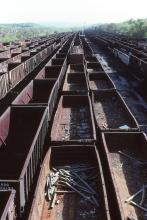 Multitudes of stored freight cars are present in this 1999 view of Rose Yard, looking east.