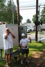 Previous Next CRHS resident signal expert and Conrail Quarterly Co-Editor, Joe Marchinchin (right) ensures our Route 230 crossing signals are operational as a local resident (left) covers his ears as the Alco blows for the crossing. Amateur! Photo By Kris Klemick Year 2010 Original Date 6/13/10 Collection CRHS Conrail Photo Archive Contributions