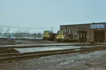 CR NW2 9213 (ex-EL 406) and SW900 449, soon to be renumbered 9020, rest outside the Scranton Diesel shop in April, 1977.