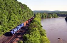 Big Blue skirts a muddy Juniata River near Aqueduct in a view taken off the US 11/15 overpass just west of Duncannon.