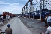 Railfans enjoy a tour of the Selkirk engine house during the NRHS convention of 1988. The excursion's power was the Morristown and Erie Alcos to the left, while Conrail U23B 2791 takes sand at the maintenance facility. Today it's hard to imagine a railroad inviting any railfans, let alone a whole train load onto thier property.