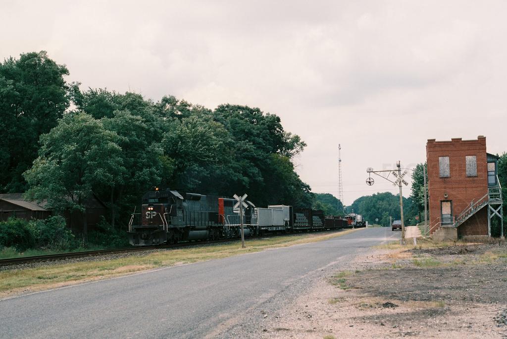 In August 1992, an eastbound Conrail freight behind SP 8493 and 7212 passes the closed Vandalia Tower which formerly protected the crossing with IC's Gruber Line. Doug Davidson photo with permission