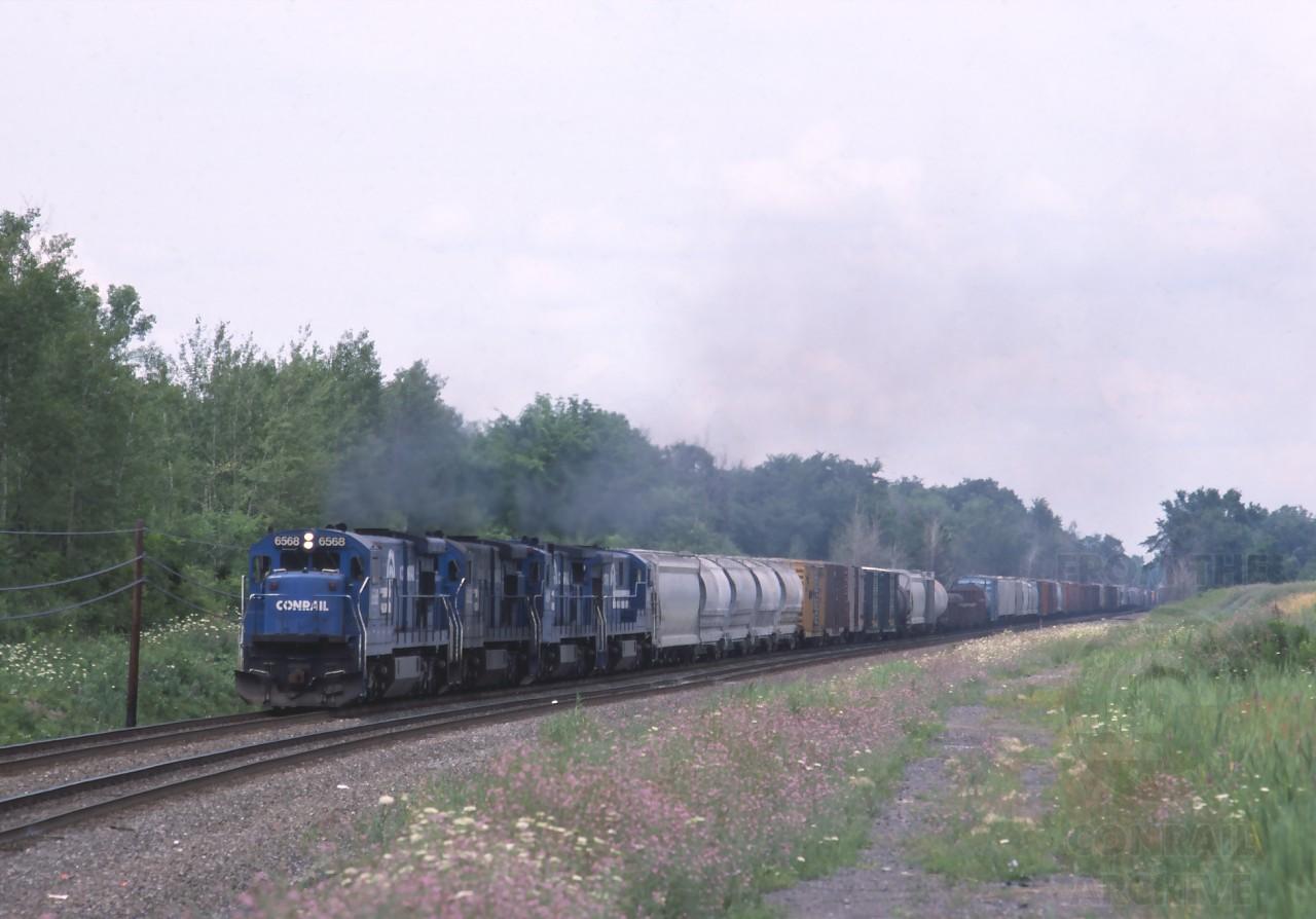 Another train seen while waiting for the SPL, SEPW, led by the 6568 is between CP SK and the Hudson River on the Castleton Cutoff.