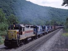 WHOOPS! Call this the one that almost got away, or....be sure you've loaded a round BEFORE the target presents itself. Ex E-L GP35 3682 leads westbound SPSE through Middlefield, MA. on Aug. 6, 1982. Gotta remember to cock the shutter!