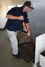 Kris Klemick cleaning up before the new stove is installed, and yes that's a baby spoon in my hat. Afterall, I had a 1 year old with me!