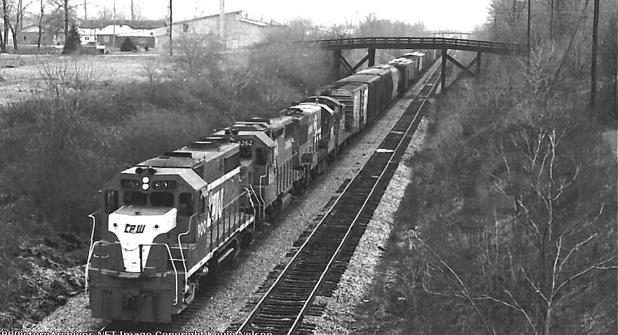 Standing on the IND 22 highway bridge enabled Kevin to get his first and last shot ever of a TP&W on the point of Conrail's LOCO(Logansport to Columbus) here in Upland, IN on Jan. 18, 1980. TPW power occasionally pooled back and forth between Logansport and Columbus on this train and its counterpart(COLO). Kevin Nelson photo with permission.
