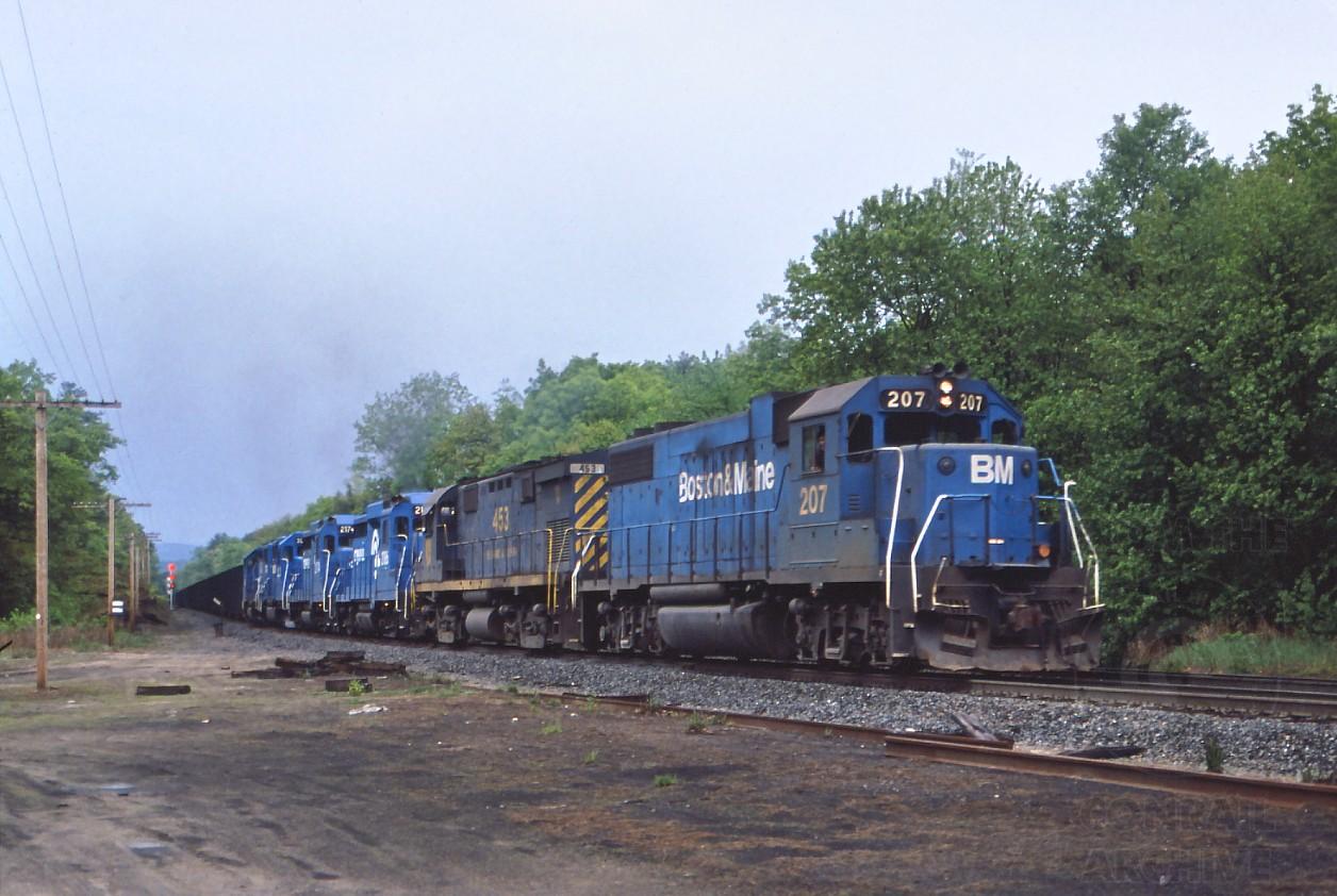 UBO-2A, a loaded coal train bound for the Public Service of New Hampshire generating plant in Bow, NH. grinds through Montague depot, MA. on May 26, 1984. Won't see a lash-up like that on the B&A, and not least for the C424M (DH 453), either...read on.