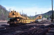 Work train with a variety of "things"..too much to mention...at Chester, MA. on May 9, 1981. Numbers on the "gons/flats" are CR 59557 and PC 59400...I think. Crane nearest is CC1006.