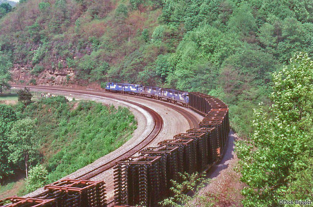 Previous Next Photo By Dick Bregler A westbound freight with a block of auto frames (likely coming from the Dana plant in Reading) climbs the curve in 1982. Year 1982 Original Date 5/1/82 Location Horseshoe Curve PA Additional Galleries 1982 Images Collection CRHS Conrail Photo Archive Contributions