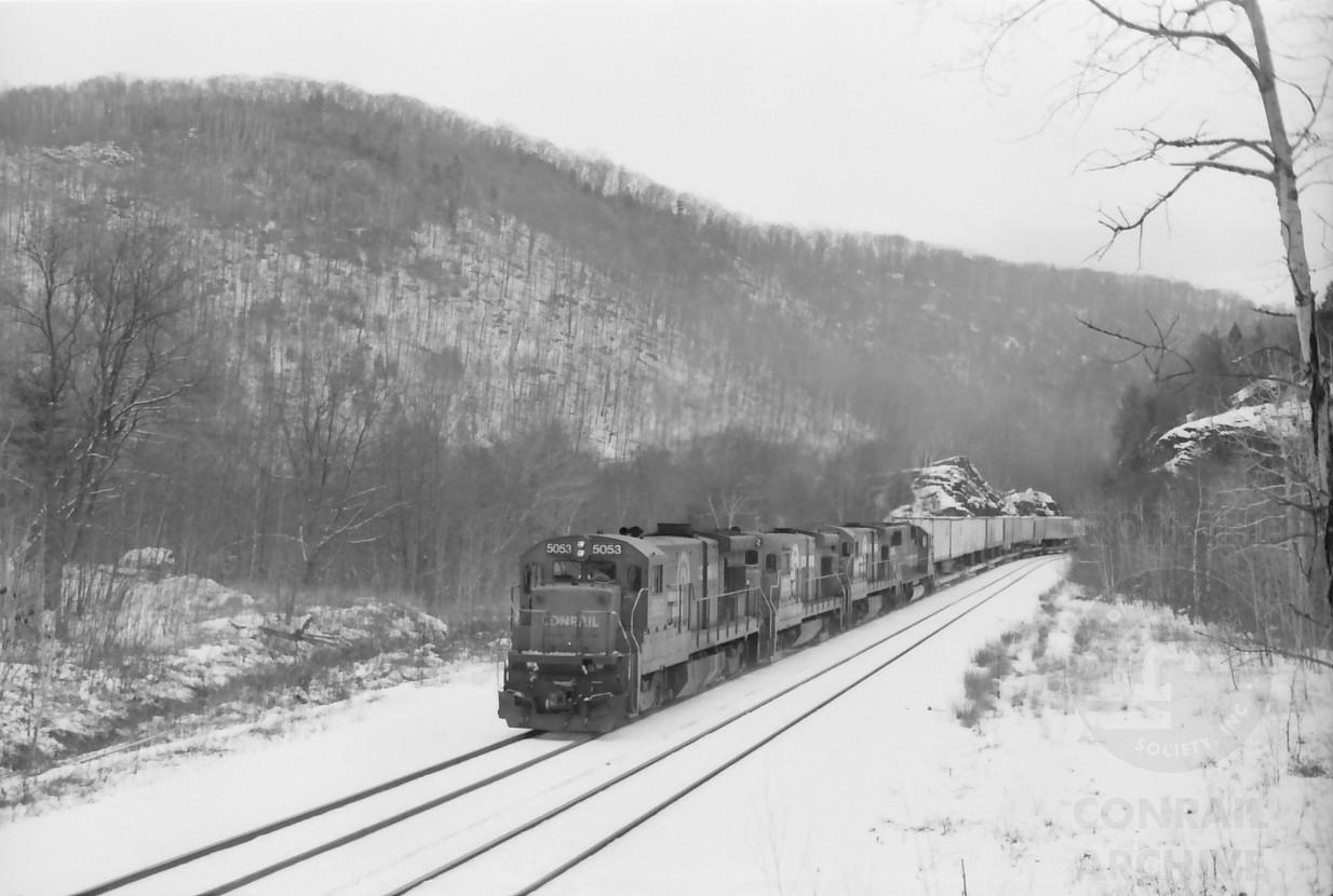B36-7 5053 on the point of TV-9 approaching Bancroft, MA. Second unit out is B23-7 2012, no stranger to these rails, but the 5053 is.