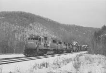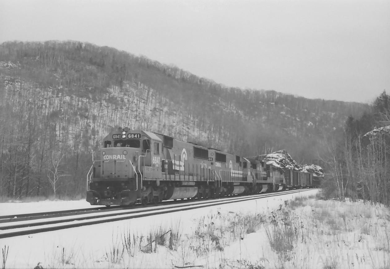 Ex demo SD60 6841 leads NESE at mile 130.2 in Middlefield, MA. near Bancroft to complete the unusual lash-ups this day.
