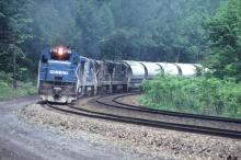 CR 2708 leads westbound merchandise with a group of other 4 axle GE's around the horseshoe between MP 128 and MP 129 in Middlefield, MA. in June, 1979.