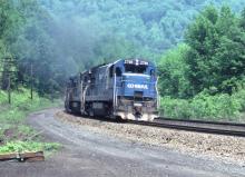 CR 2798, "the last U-Boat", leads westbound tonnage around the horseshoe in Middlefield, MA. in June, 1979.
