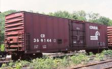 CR 369144 is seen in storage at Hollidaysburg PA on 6/18/02. Car is ex PC 369144, built 10-72 and rebuilt 3-90. Car was later sold and became YARR 5070 and then FRR 5070.