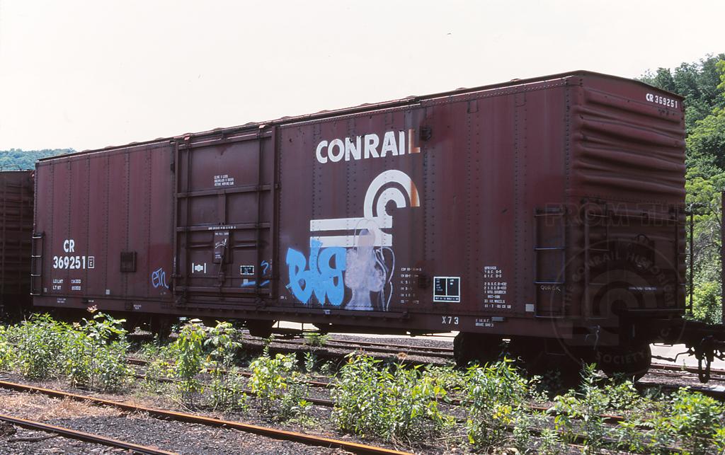 CR 369251 is seen in storage at Hollidaysburg PA on 6/18/02. Car is ex PC 369251, built 10-72 and rebuilt 11-89. Car was later sold and became YARR 5079.