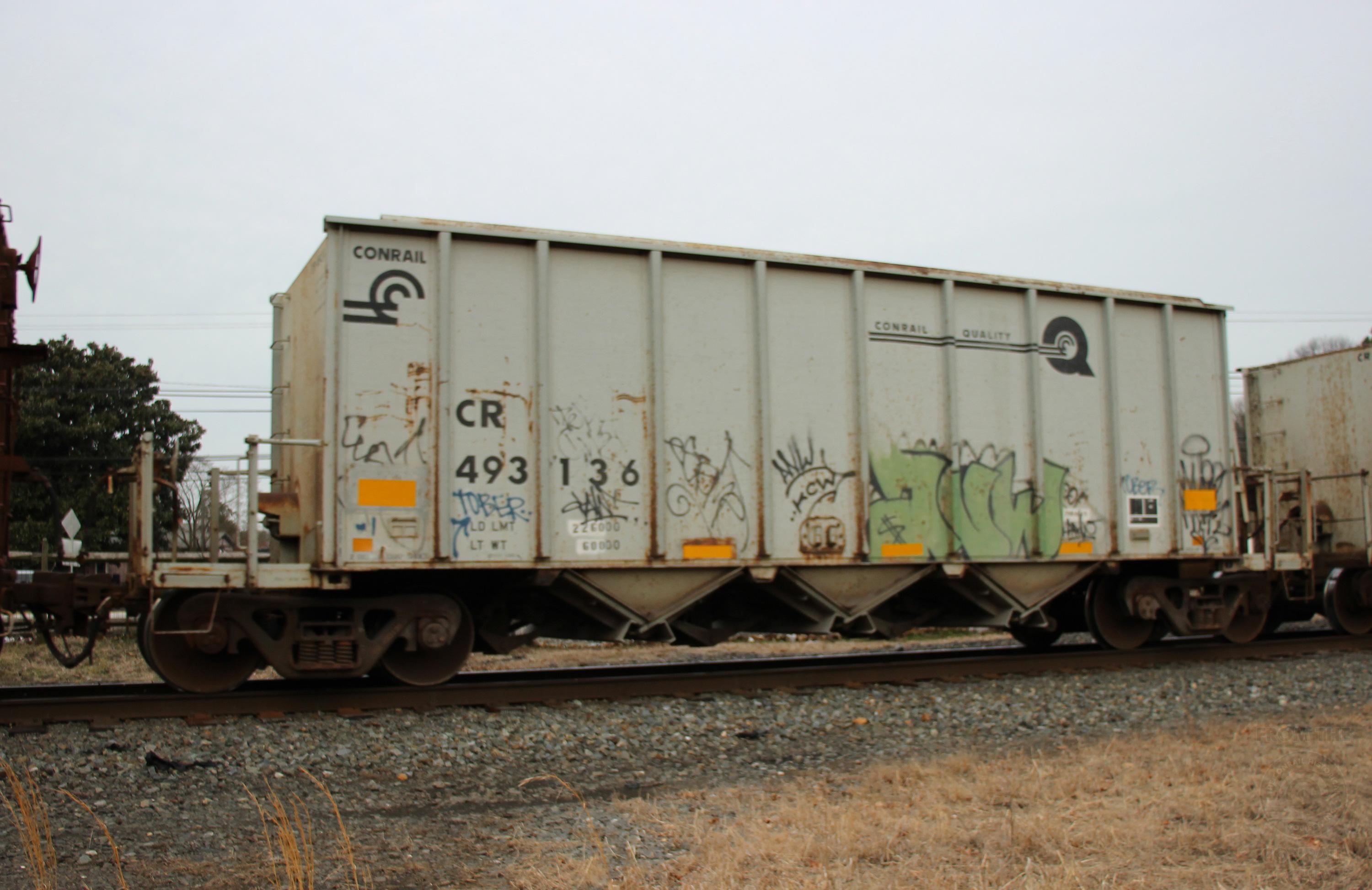 CR 493136 is seen in the consist of DCR-01 at Kirkwood, DE on 2/23/19. Car was built 1-92 by Trinity.
