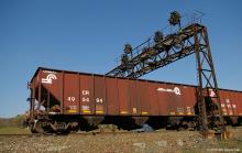 CR 495494 brings up the marker of an eastbound NS coal train at the PRR era signal bridge at M.P. 225, Tipton, PA.