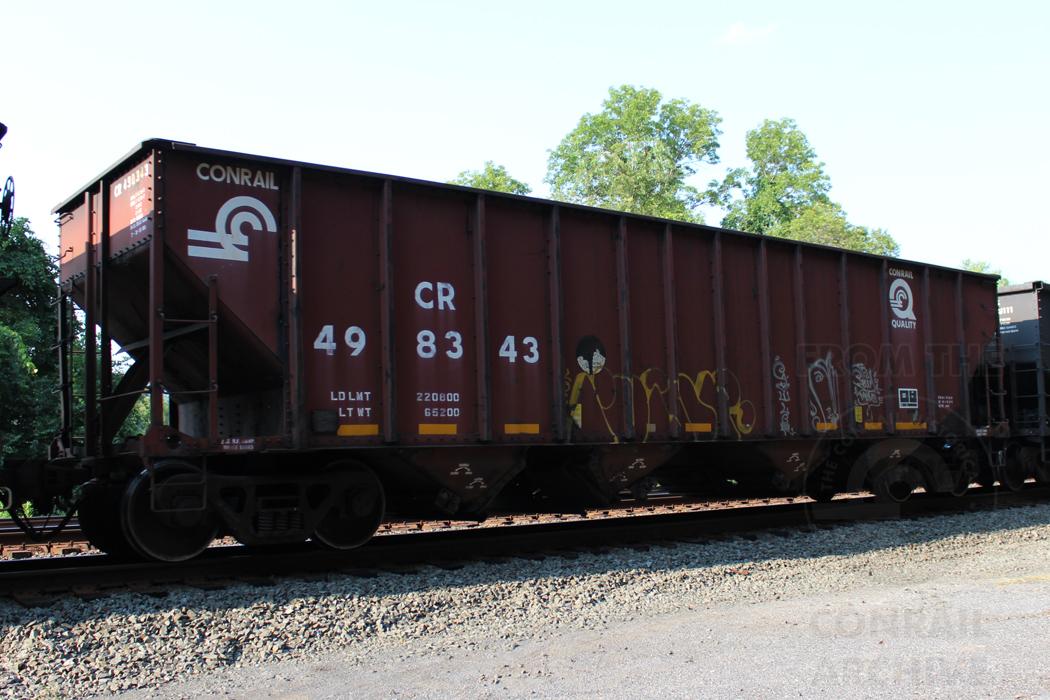 CR 498343 is seen in the consist of NS M0G at Marysville, PA on 8/9/14. Car was built 7-96 by HCS.