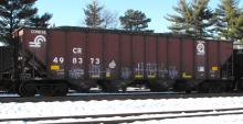 CR 498373 is seen at Deepwater, NJ on 12/12/13. Car was built 8-96 by HCS. Photographing any of the CR lettered, NS owned, H2 class hoppers that were built at the Hollidaysburg Car Shops is getting harder to do as over 1,500 of these cars have been re-bodied to 3 bay hoppers by Freight Car America in Roanoke, VA for NS.