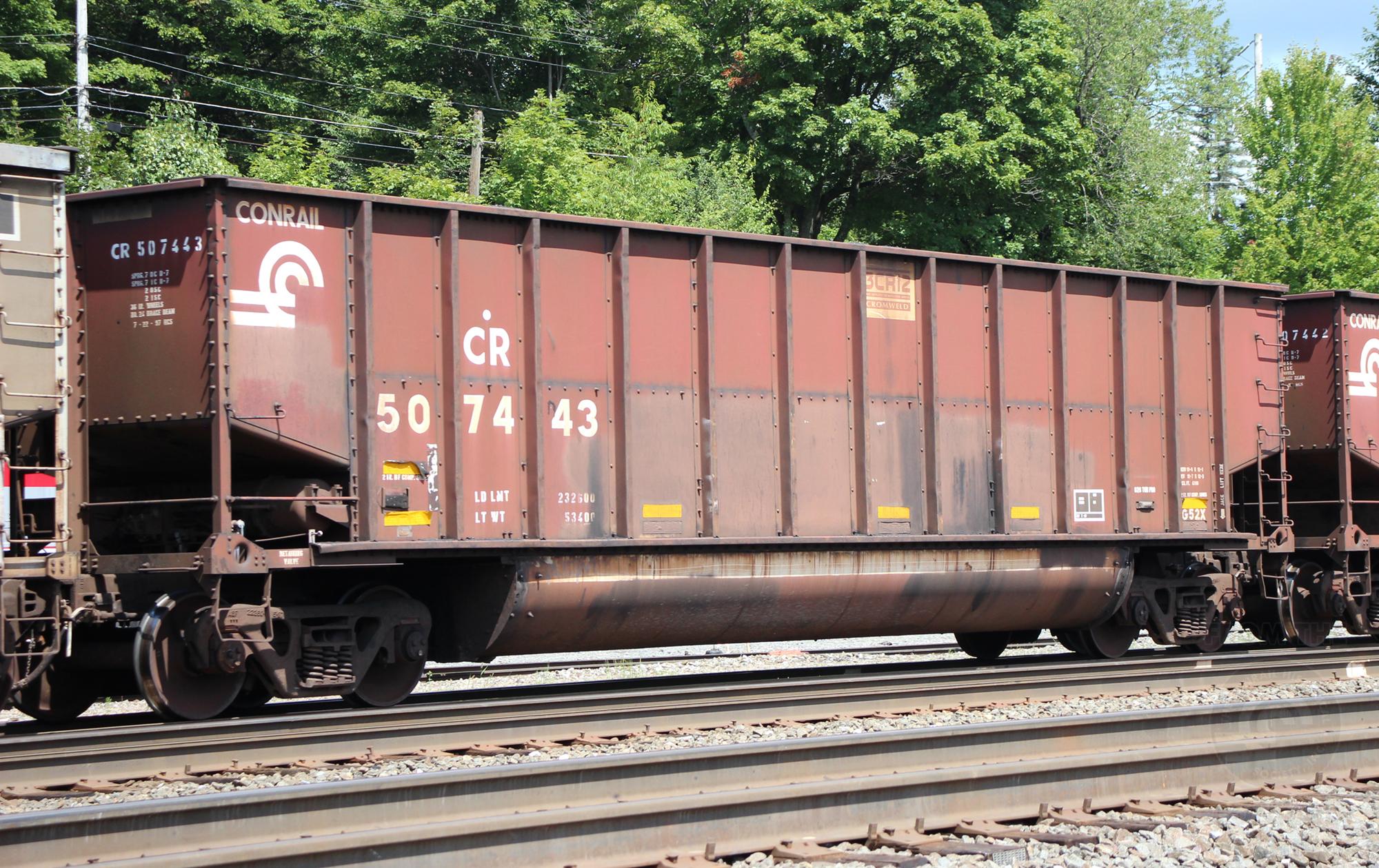 CR 507443 is seen in the consist of NS Y95 at Cresson, PA on 8/10/24.Car was built 7-97 (painted 7-22-97) by HCS.