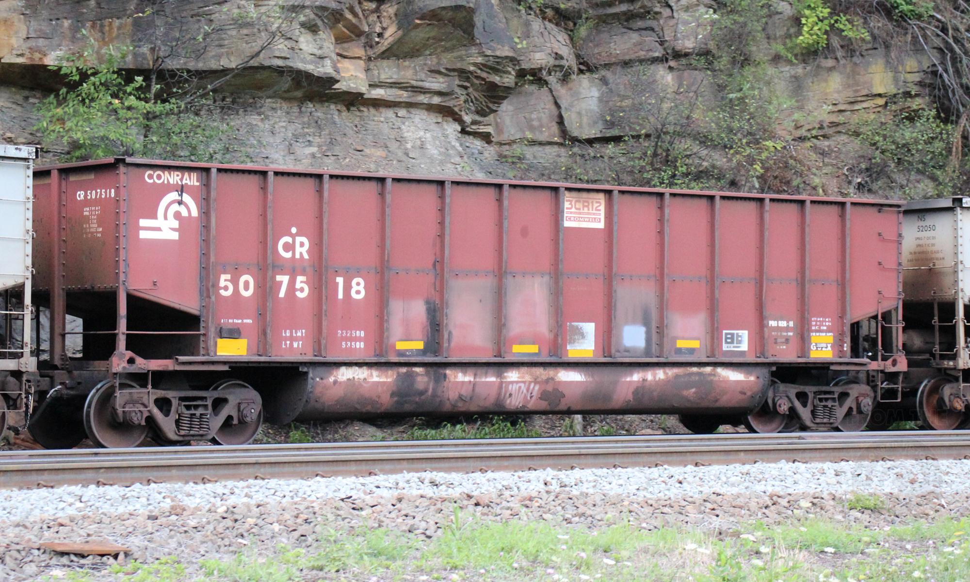 CR 507518 is seen in the consist of NS 595-10 as it rounds Horseshoe Curve in Altoona, PA on 8/10/24. Car was built 8-97(painted 8-17-97) by HCS.