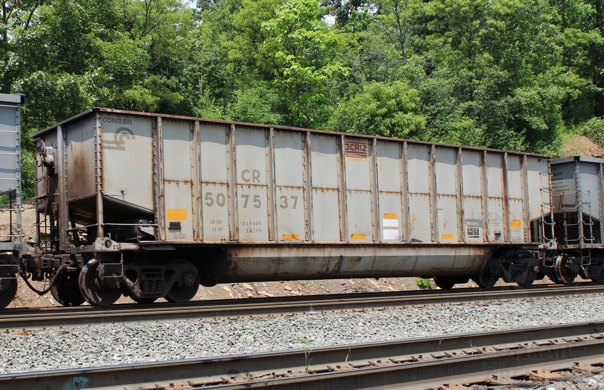 The one and only grey CR G52X, CR 507537, is seen in the consist on NS 747 at the Brickyard in Altoona, PA on 6/13/14. Car was built 8-97 by HCS.