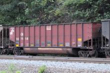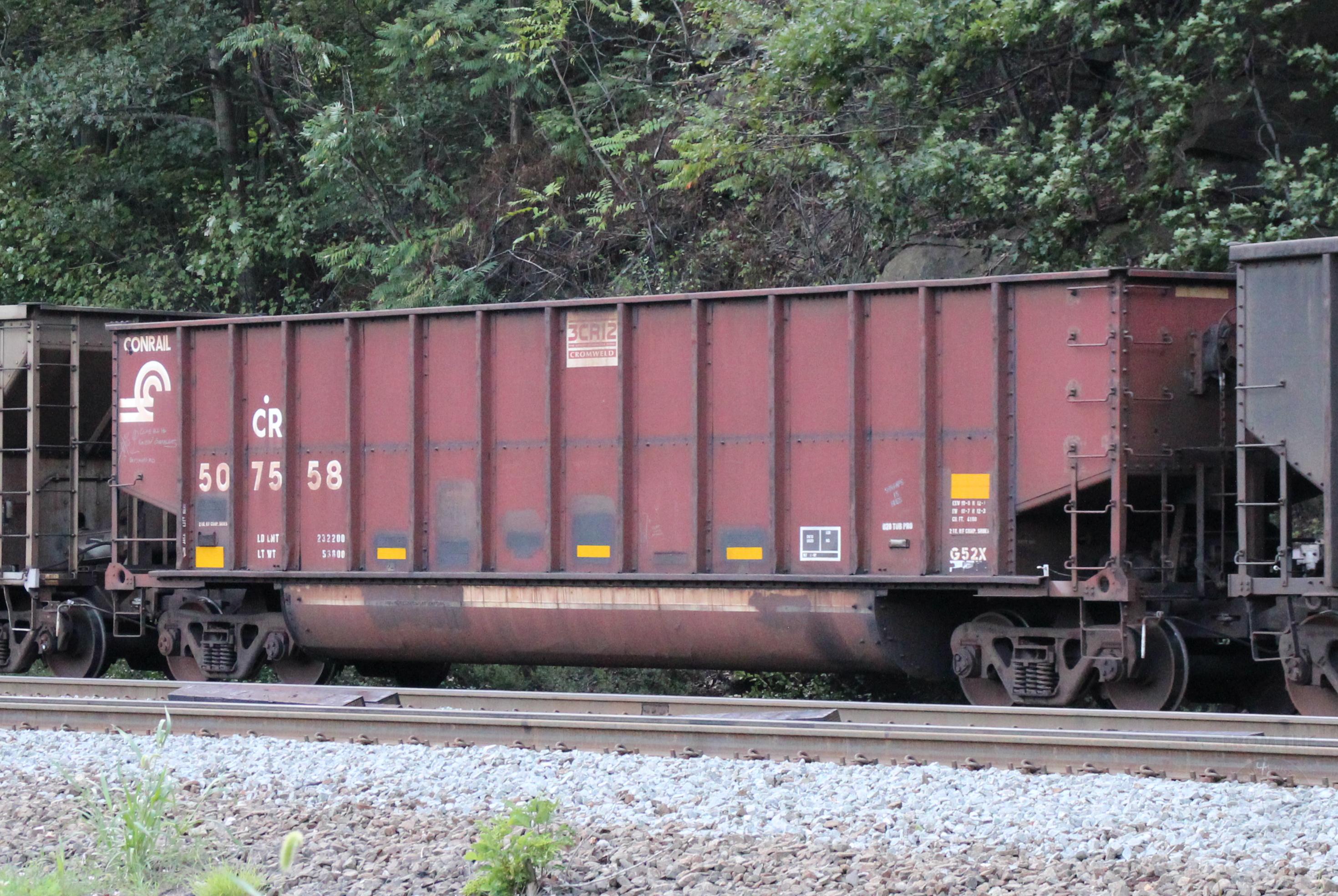 CR 507558 is seen in the consist of NS 595-10 as it rounds Horseshoe Curve in Altoona, PA on 8/10/24. Car was built 8-97(painted 8-26-97) by HCS.