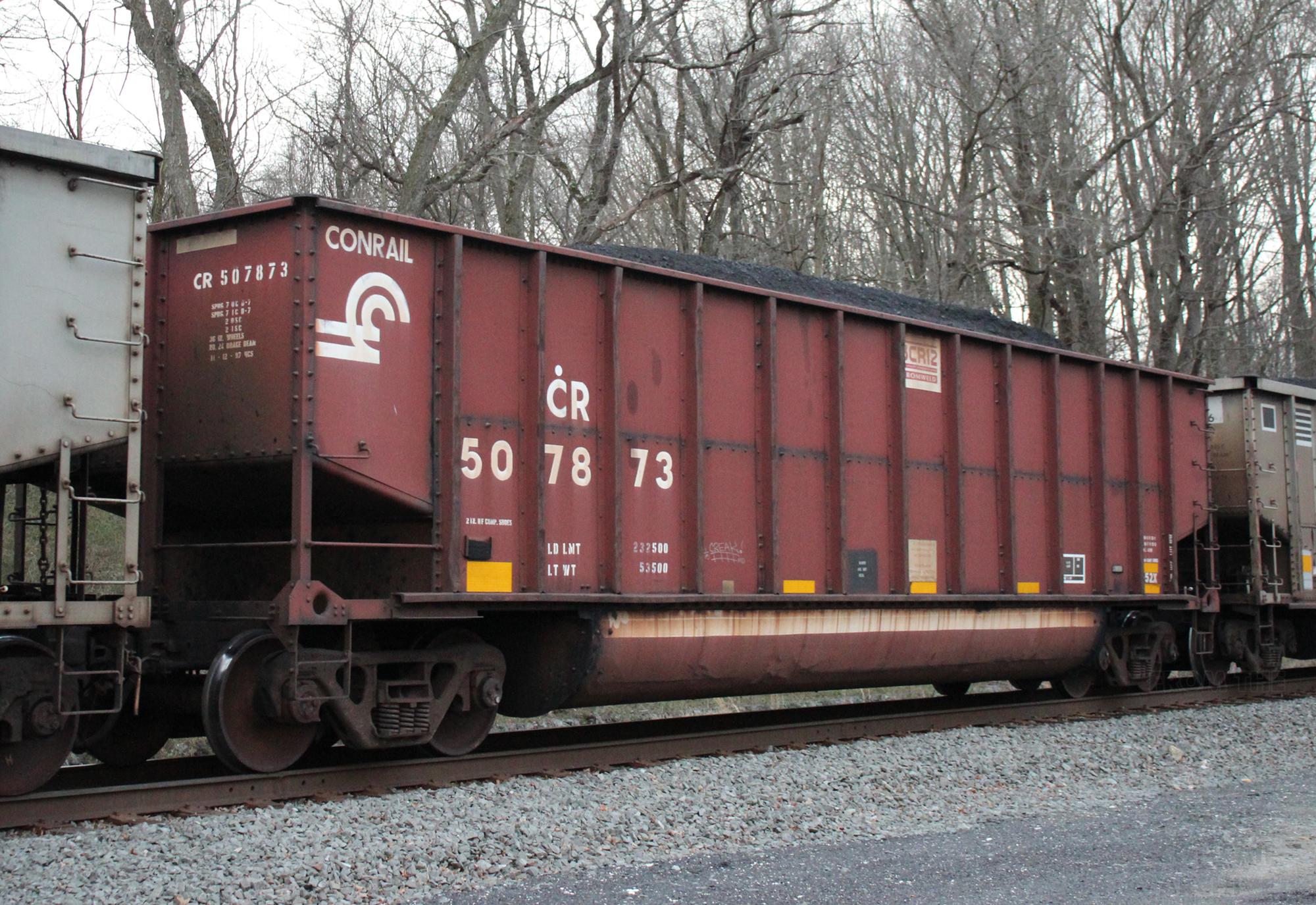 CR 507873 is seen in the consist of DCR-01 (NS 568) at Porter, DE on 3/17/23. Car was built 11-97 (painted 11-12-97) by HCS.