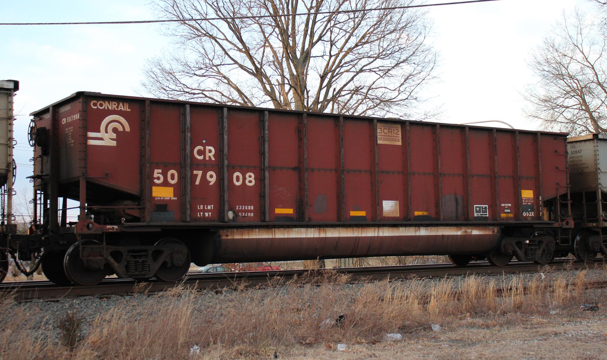 CR 507908 is seen in the consist of 569 at New Castle, DEon 2/23/22. Car was built 11-97 (painted 11-20-97) by HCS.