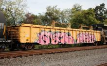 CR 55353 is seen in the consist of NS 12G at Cove, PA on 10/18/25. Car is ex PC 598702 and was built 5-72 by Fruehauf.