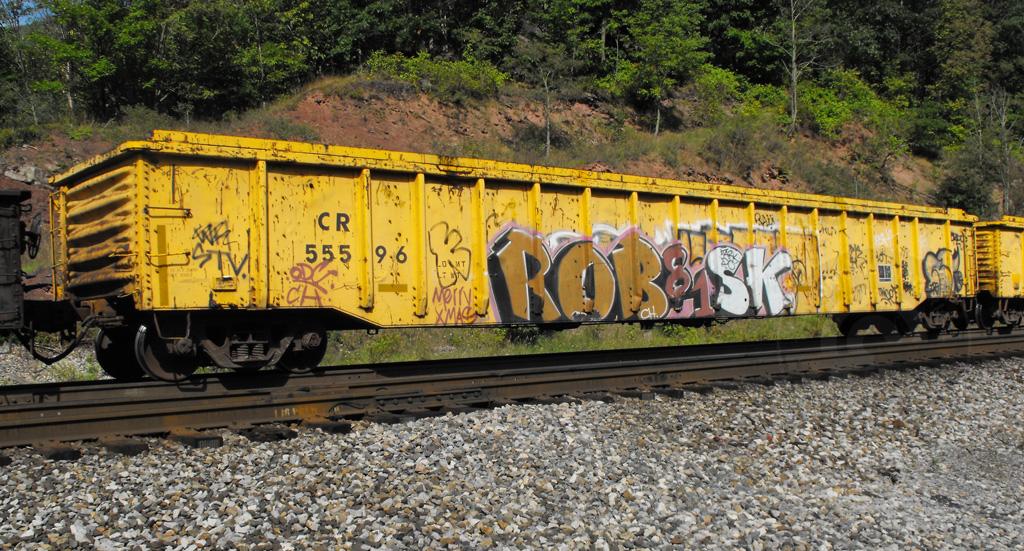 CR 55596 is seen on W951-08 at Fairhope PA on 8/11/12. Car is ex PC 598643 and was built 5-72 by Fruehauf. Car was repainted yellow CR-BL 3-89 and placed in MOW service.