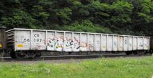 CR 56197 is seen in NS 10G on Horseshoe Curve in Altoona PA on 6/28/13. Car is ex PC 598356 and was built 6-68.