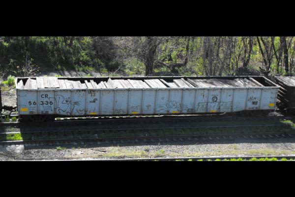 This car, Class GE61F is former Erie Lackawanna gondola 43841 now used in CR MOW service. The car is seen loaded with dead ties going into Enola, PA in November 2008.