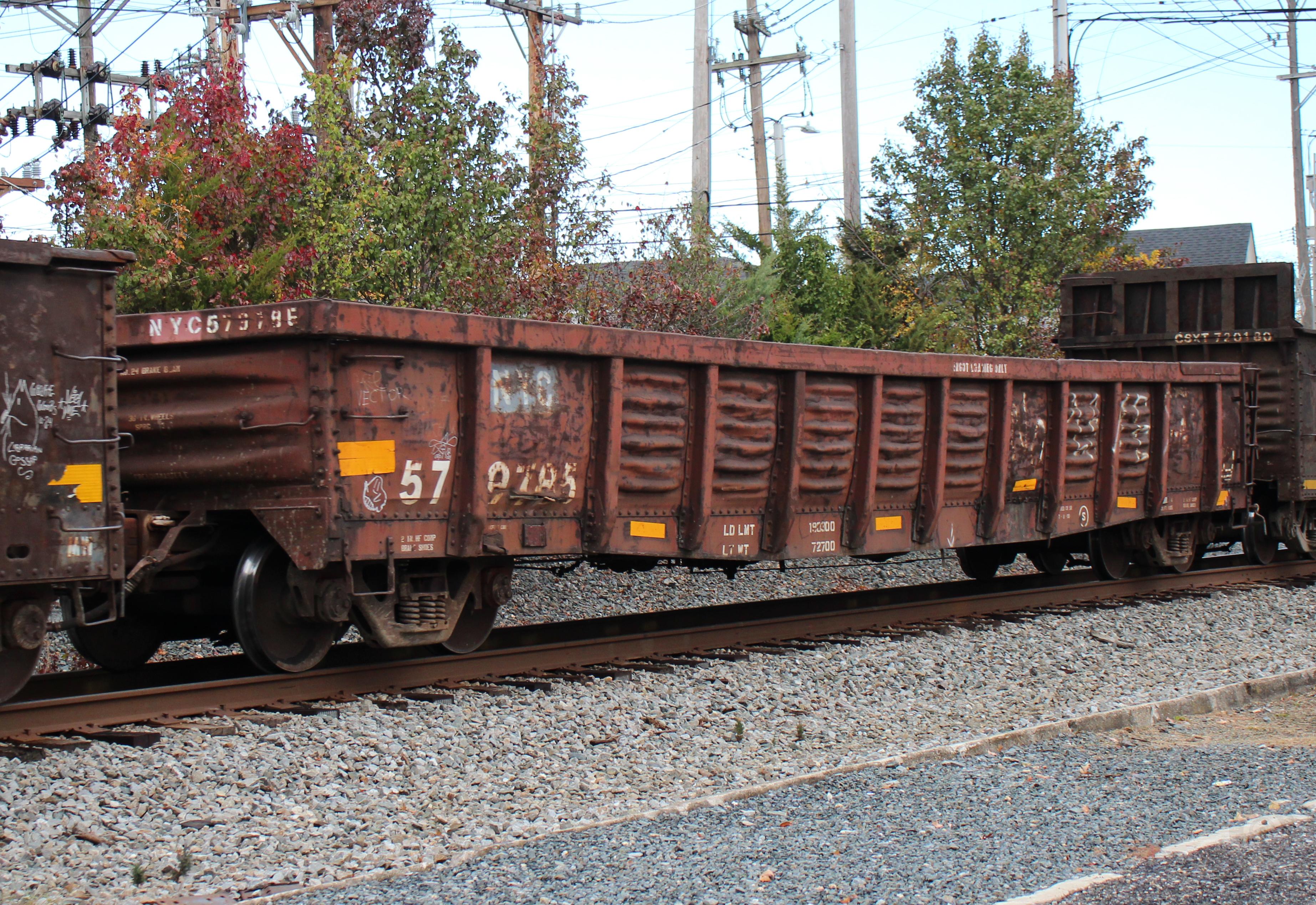 NYC 579785 is seen in the consist of CSX M371-01 at Newark, DE on 11/1/24. Car is ex CR 579785/CR 564667/PC 564667, built 12-69 and was rebuilt 7-90.