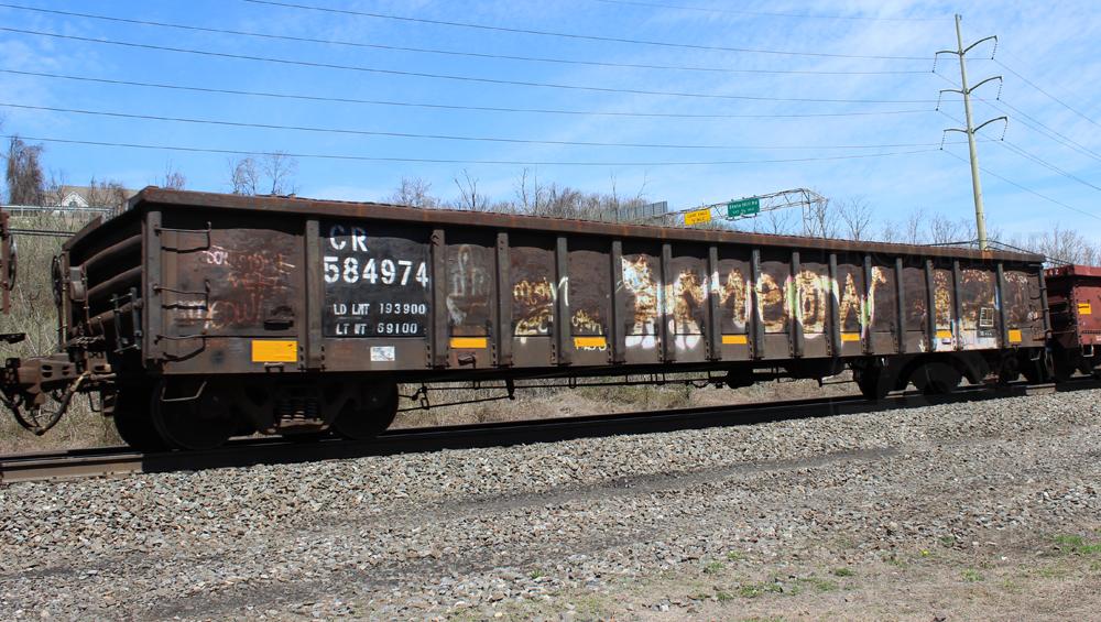 CR 584974 is seen in the consist of EB NS 61N at Wyomissing, PA on 4/16/15. Car is ex SB 6144 and was built 5-80.