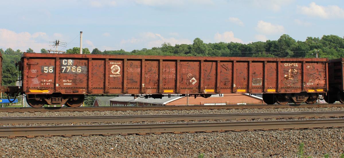 CR 587766 is seen in the consist of EB NS 11X at Cresson, PA on 6/12/15. Car is ex CR 580430/PC 580430 and was built 12-71.