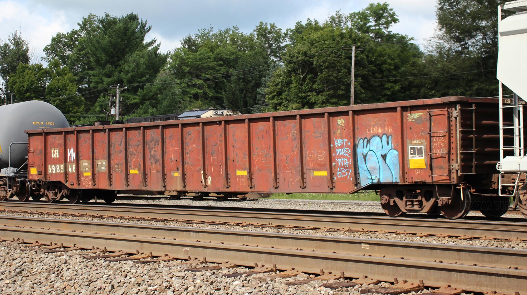 CR 598948 is seen in the consist of NS 36A at Cresson, PA on 8/10/24. Car was built 6-72 by Fruehauf and was painted CR DL 7-81.