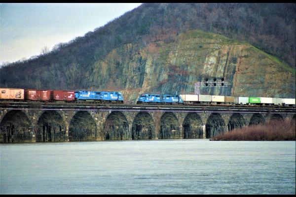 CR. Freight trains meet on Rockville Bridge, April 1983