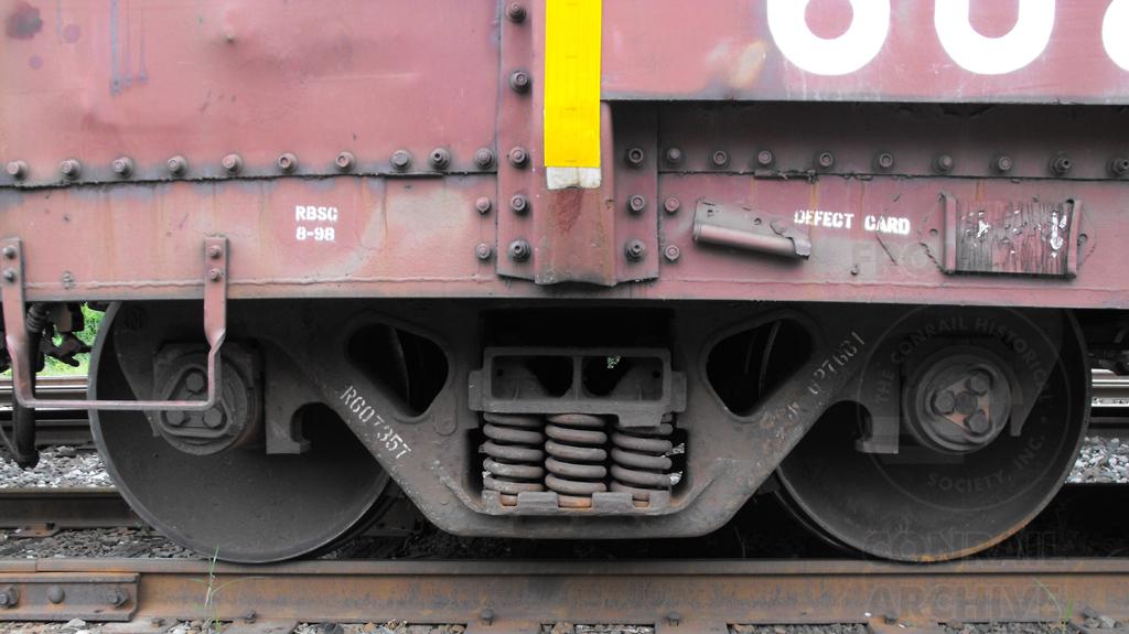 A close-up view of the side frame on the left side of the A-end of CR 608298 shows it has been under CR 607357 & CR 627661 at some point in time. Seen at Essington PA on 8/15/10.
