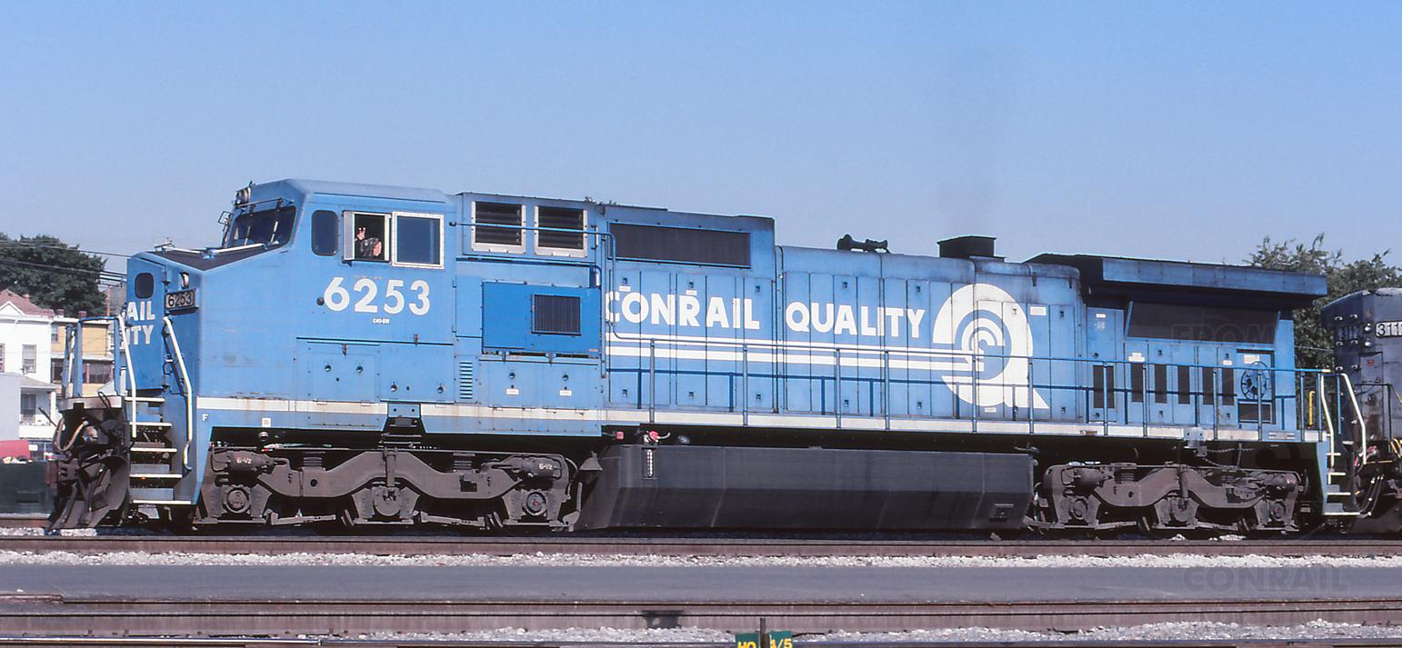 CR 6253, soon to become CSXT 7383, is on the point of a westbound at Cumberland, MD on 9/26/99.