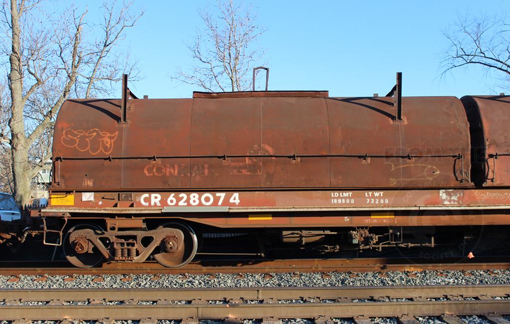 A view of the left end of CR 628074 at Westville, NJ on 2/13/15. Car was built 9-77 by Thrall.