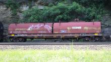 CR 628236 is seen in the consist of NS 35A as it rounds Horseshoe Curve in Altoona, PA on 6/21/19. Car was built 10-77 by Thrall.