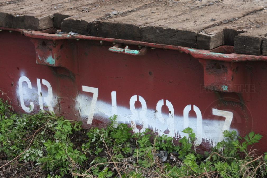 Whitelined F41 Flat 718907 lies half buried in the dirt and weeds in the yard at Morrisville, PA. Look closely and you'll see the Penn Central jade green paint bleeding thru...
