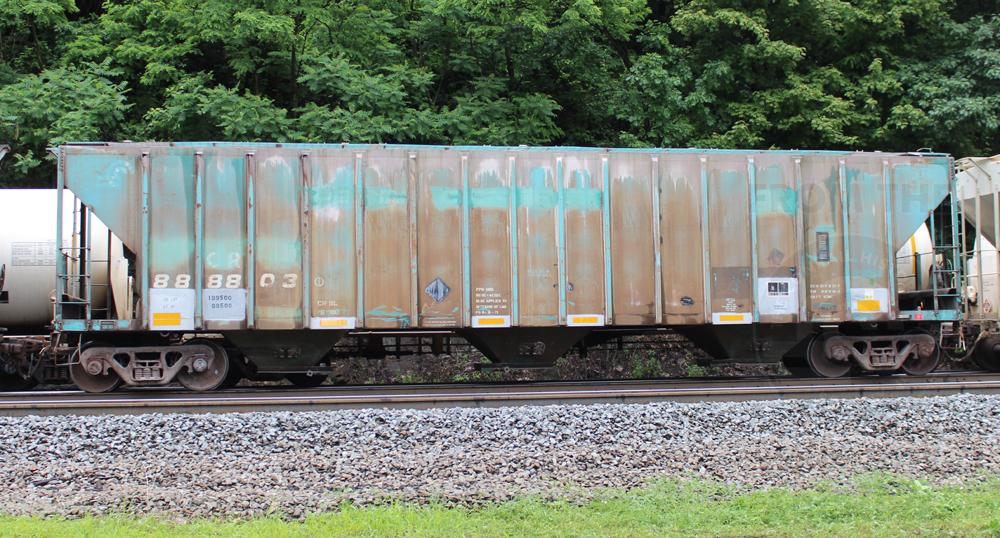 CR 888803 is seen in the consist of WB NS C91 as it rounds Horseshoe Curve in Altoona, PA on 6/16/16. Car is ex PCB 888803 and was built 8-71 by P-S at their Butler, PA plant as part of Lot 9561.