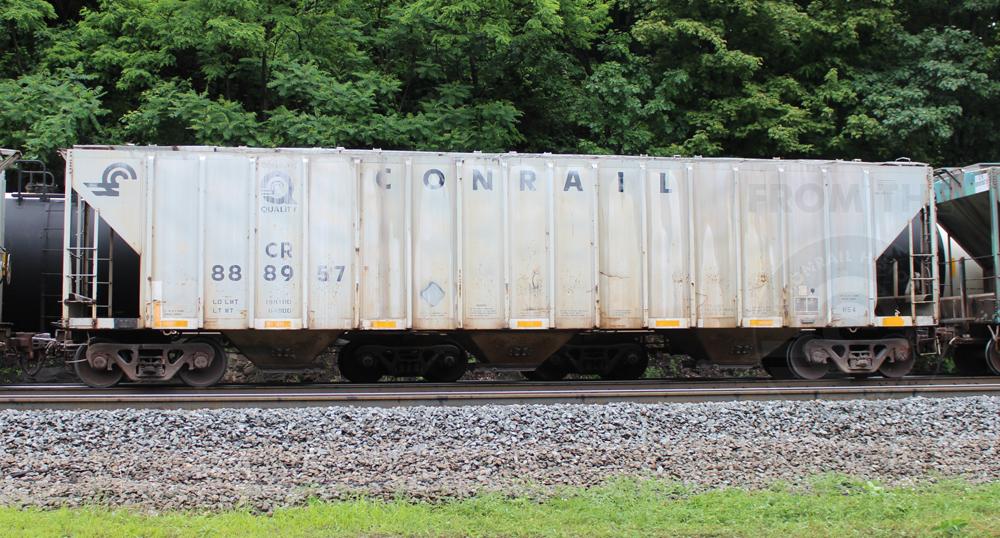CR 888957 is seen in the consist of WB NS C91 as it rounds Horseshoe Curve in Altoona, PA on 6/16/16. Car is ex PCB 888957, built 8-71 and rebuilt 9-92.