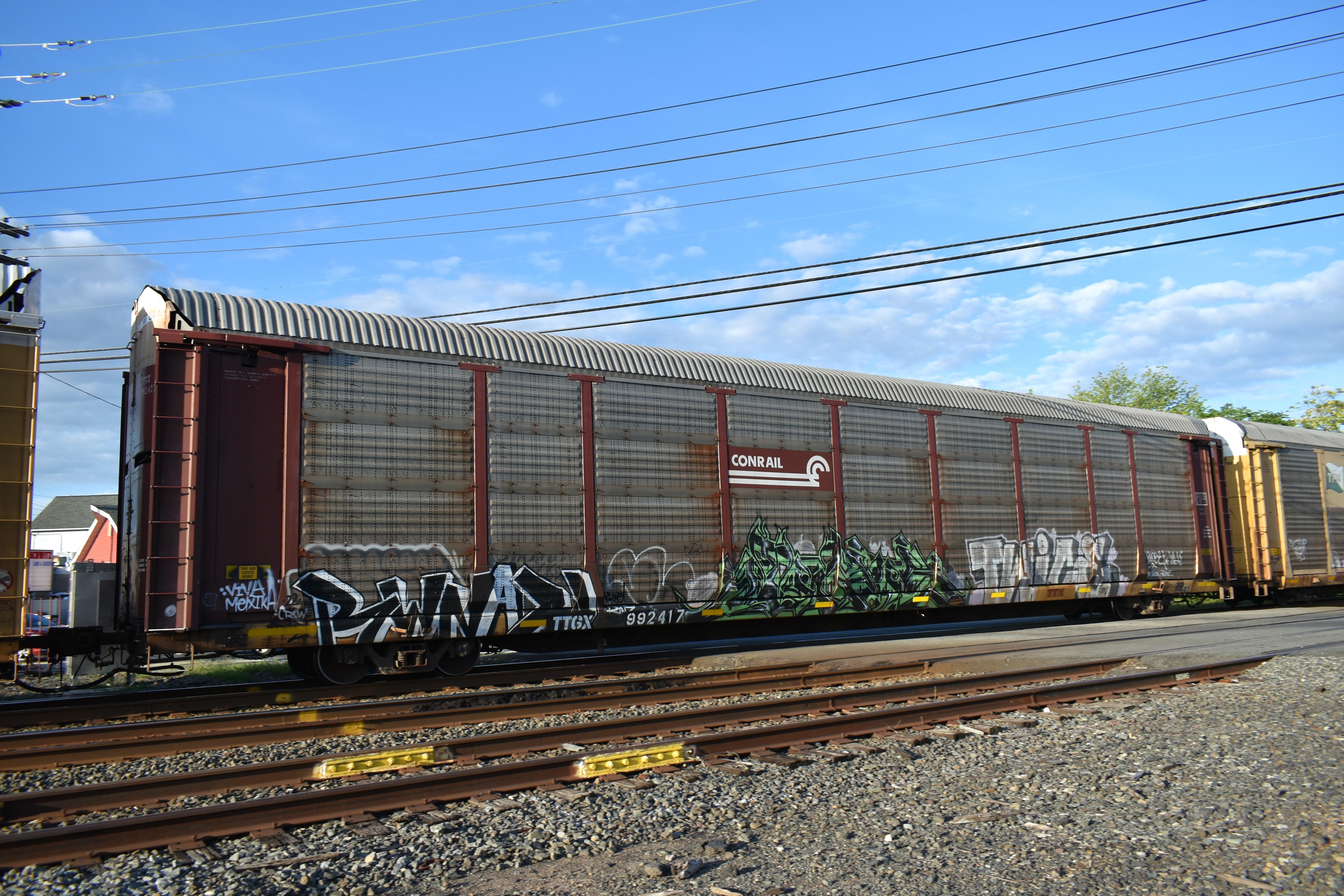 Auto rack #TTGX 992417. Westbound CSX freight, Front Street, South Plainfield, NJ. 8/19/25.