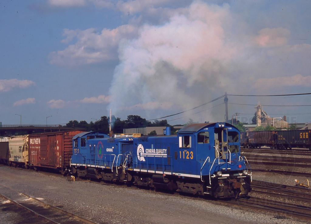 CSX SW1001's 1123-1121 make a hard pull at the east end of Pavonia Yard in Camden, NJ on 6/4/2001. I was putting my power away for the day when this started up.. Life at the office is hard!! Notice the 1121, Ex Conrail 9402 has the old Phila Division logo on it, one of two units(the other GP38 7868) to have the logos applied.